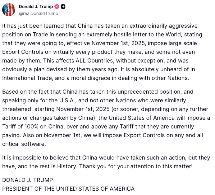 သမ္မတ ထရမ့်က အမေရိကန်စံတော်ချိန် သောကြာနေ့ နေ့လယ်တွင် ၁၀၀ ရာခိုင်နှုန်း အကောက်ခွန်စည်းကြပ်မှုကို အတည်ပြုခဲ့ပြီး တရုတ်သမ္မတ ရှီကျင့်ဖျင် နှင့် တွေ့ဆုံရန် စီစဉ်ထားသော အစီအစဉ်ကို ဖျက်သိမ်းလိုက်ကြောင်း သတင်းများ ထွက်ပေါ်ခဲ့သည်။ သို့သော် ထရမ့်သည် နောက်ပိုင်းတွင် ၎င်း၏ ရပ်တည်ချက်ကို လျှော့ချခဲ့ပြီး သမ္မတ ရှီကျင့်ဖျင်နှင့် တွေ့ဆုံရန် ပွင့်လင်းနေဆဲဖြစ်ကြောင်းနှင့် တရုတ်နိုင်ငံက ၎င်း၏ မူဝါဒသစ်ကို နိုဝင်ဘာလ ၁ ရက်နေ့မတိုင်မီ ပြောင်းပြန်လှန်ပါက အခွန်တိုးမြှင့်မှုကို ရုပ်သိမ်းနိုင်ကြောင်း ပြောကြားခဲ့သည်။