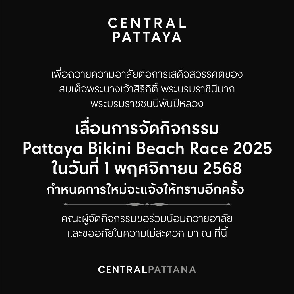 ထို့အပြင် နိုဝင်ဘာ ၁ ရက်နေ့တွင် ကျင်းပရန် စီစဉ်ထားသော Pattaya Bikini Beach Race 2025 (ပတ္တရား ဘီကီနီ ကမ်းခြေ ပြေးပွဲ) ကိုမူ ရွှေ့ဆိုင်းလိုက်ပြီဖြစ်ကြောင်း သတင်းရရှိသည်။