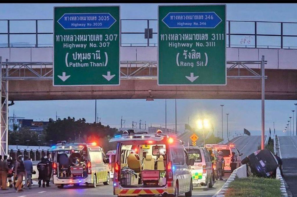 ယာဉ်တိုက်မှုသည် Pathum Thani-Rangsit တံတားအနီးရှိ အဝေးပြေးလမ်း ၃၄၆ တွင် ဖြစ်ပွားခဲ့ပြီး နံနက် ၅:၃၀ နာရီခန့်တွင် သတင်းပို့ခဲ့ကြောင်း Muang ရဲစခန်းမှ စုံစမ်းရေးမှူး Pol Lt Suthon Jitphum က ပြောသည်။ ယာဉ်သည် Ban Changရပ်ကွက်ရှိ Santisuk လမ်းဆုံဘက်သို့ ဦးတည်မောင်းနှင်နေခဲ့ကြောင်းလည်း သိရသည်။